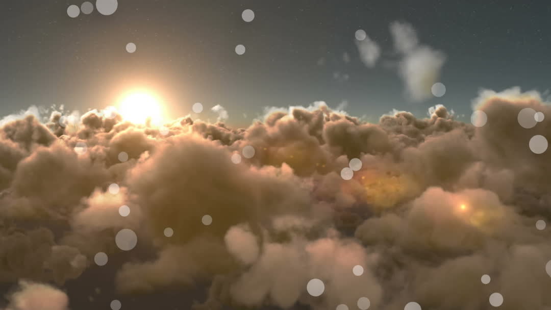 A serene, dream-like scene where the sun illuminates scattered clouds, augmented by gently moving white spheres. This gives an ethereal feel suitable for nature, travel quests, or imaginative themes involving exploration and meditation. Ideal for emphasizing elements of education, tourism insights, medical or atmospheric research presentations, or quarter catchy backdrops to music and meditation channels.
