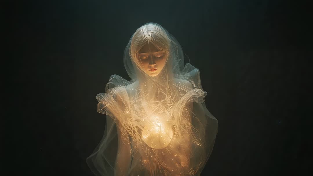 AI Generated Image. Footage showing solitary woman holding glowing orb, orb emitting pulsing amber light and streaming filaments. Veil and translucent gown flowing while orb pulsing, creating soft rim highlights and gentle glows across skin. Face tilting downward, eyes closing, conveying meditation and inner calm. Dark negative space enhancing contrast and focus on luminescent core. Cinematic camera movement and slow-motion capture offering immersive, contemplative mood. Ideal for meditation app intro, wellness campaign hero, spiritual podcast cover, album art, cinematic short opener, fashion film sequence, visual effects demo, luxury beauty or jewelry branding, social media teaser, website hero banner. Editing suggestions: color grading toward warm amber, adding subtle lens flare, looping orb pulse for seamless backgrounds, slowing motion for calming effect.