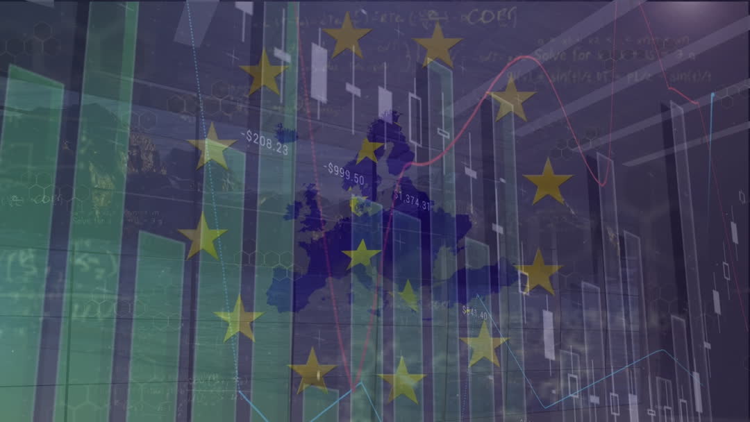 Overlay of diverse financial data and graphs on the European Union flag and map highlights EU economic analysis and financial trends. Useful for illustrating Europe-centric financial reports, tech advancements in economy, or EU economic forecasts.