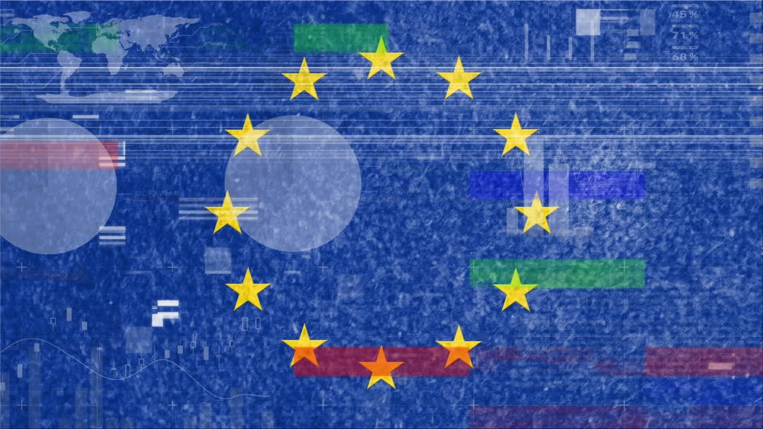 Artistic depiction of EU flag overlayed with digital interference suggests theme of data security, technology advancements, or business operations in Europe. Ideal for articles on EU tech policy, digital transformation in European markets, or cybersecurity issues.
