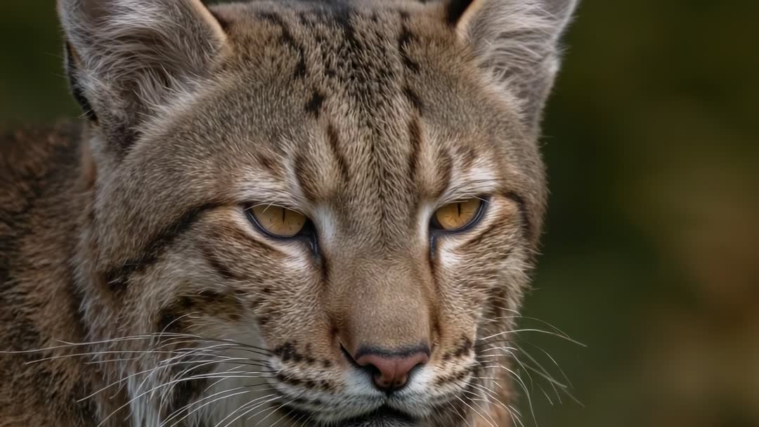 AI Generated Image. Video showing Eurasian lynx turning head toward offcamera sound while tracking movement through blurred forest foliage. Closeup three-quarter view capturing ear tufts, long whiskers, and dense fur texture with golden eyes scanning surroundings. Shallow depth of field creating cinematic isolation against soft green-brown background. Working well for wildlife documentary sequences, nature series openers, and conservation campaign visuals. Supporting educational presentations on feline behavior, stock footage libraries, social media reels, and short-form storytelling. Adapting easily to tight crops and vertical formats for mobile platforms, or full-frame 16:9 playback for TV and online streaming. Serving editorial pieces on habitat protection, print layouts for magazines and books, desktop wallpapers, and academic animal behavior study material.