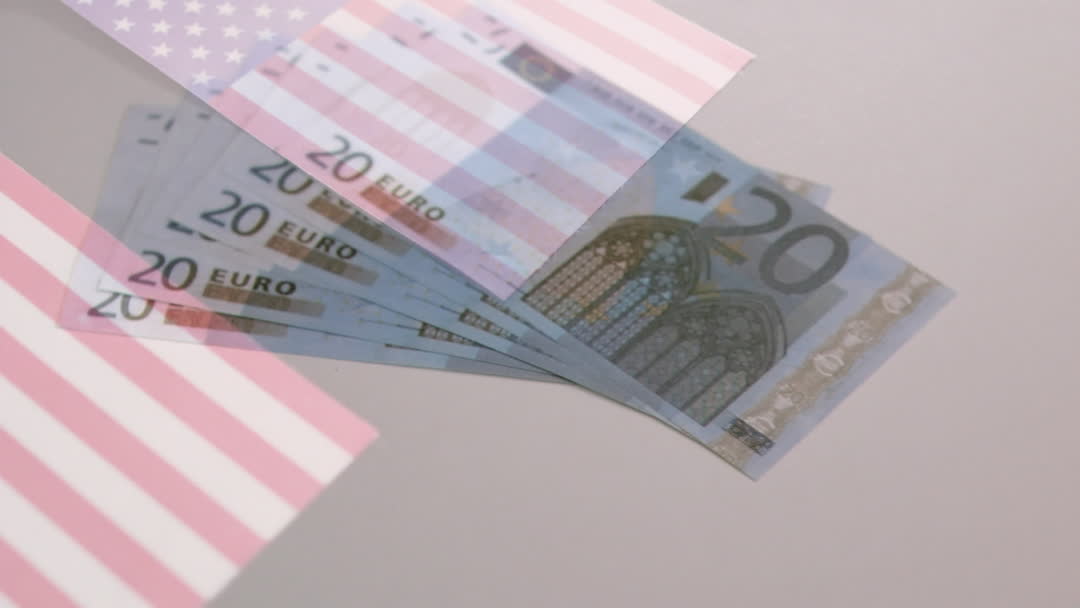 This video visualizes the interplay between currency and flags, symbolizing international trade and economic relations. The overlapping graphics evoke themes of global financial exchanges and cross-border investments. Ideal for illustrating articles or presentations about international finance, currency market news, or economic discussions pertaining to European and American interactions.