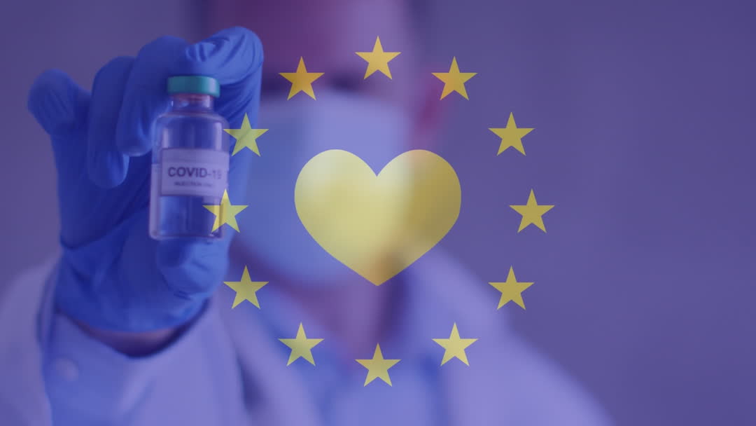 Shows a healthcare professional in lab coat and gloves holding a vaccine vial, with EU symbol and heart overlay representing unity in Europe's response to COVID-19 pandemic. Useful for articles on EU health policies, vaccination campaigns, or global healthcare initiatives.