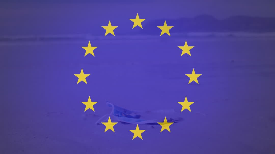 Digital animation showcases the European Union flag overlaying a discarded face mask on the beach. Visual metaphor for ongoing COVID-19 challenges, environmental impact, and public health. Useful for discussions on pollution, health protocols, and Europe's pandemic response.