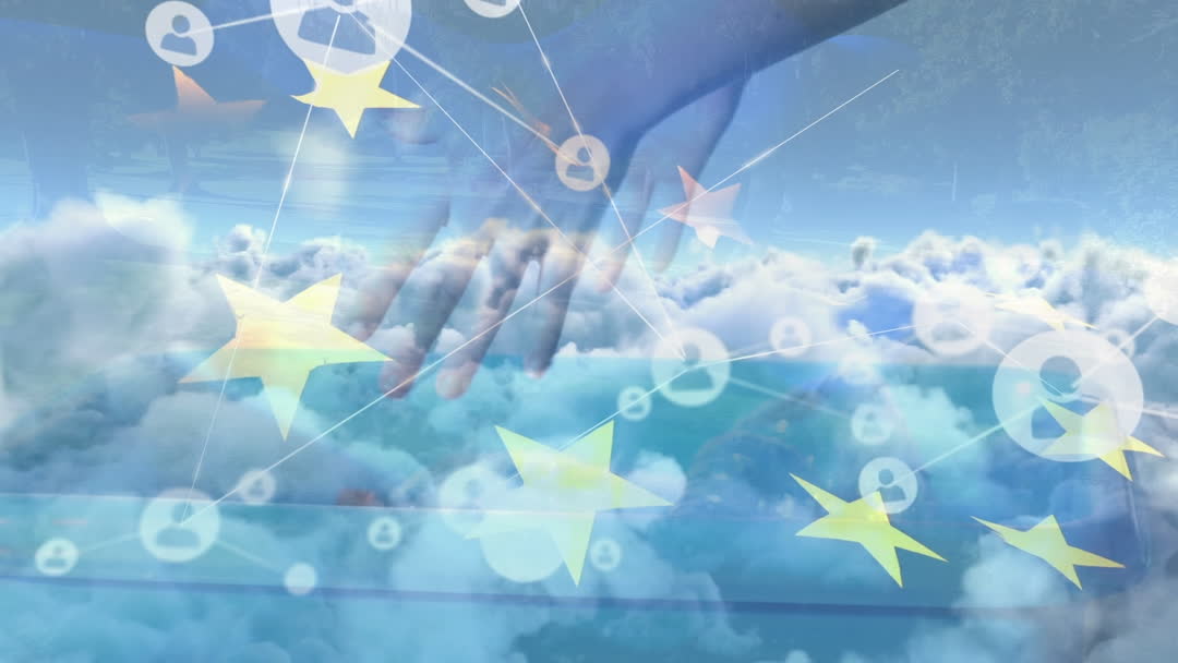 This video symbolizes European Union efforts in sustainability and recycling regulations. Overlay of clouds and networking lines exemplifies connectivity and cross-border regulations for environmental improvements. Useful for articles on EU policies, ecological research presentations, or materials discussing modern recycling innovations.