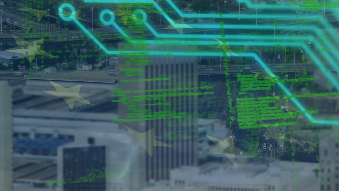 This digital animation combines data visuals and the European Union flag with an integrated circuit design superimposed on a cityscape, illustrating themes of modern urban technology, finance, and political integration. Great for use in presentations or projects related to European finance, technological innovation, or urban planning that emphasize blending data with real-world environments.