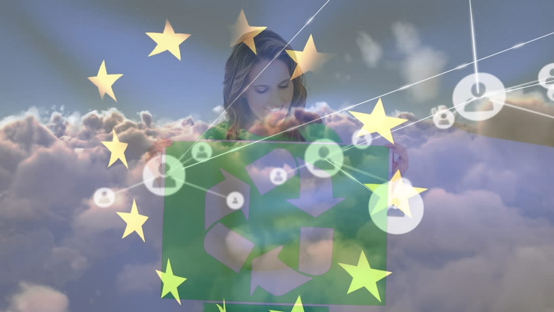 This conceptual video depicts a woman holding a recycling symbol intertwined with stars of the European Union. The cloudy sky and digital connections add a futuristic and expansive atmosphere, symbolizing European regulations and initiatives for sustainability and waste management. This is perfect for illustrating topics on eco-friendly legislation, international environmental policies, or corporate green campaigns.