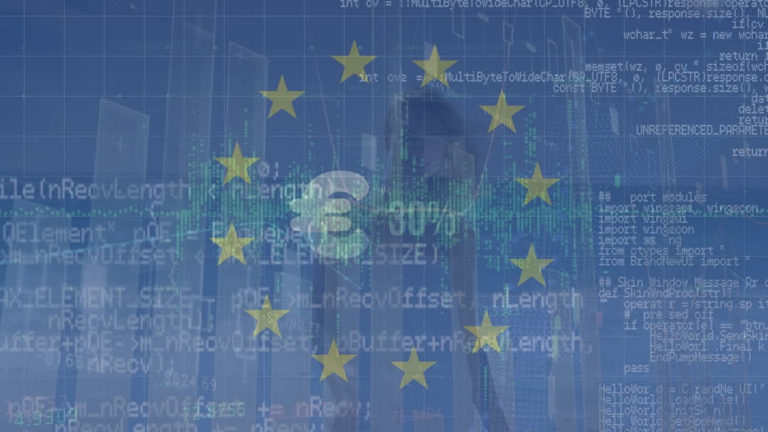Conceptual depiction of economic and technological integration within the European Union. The EU flag and euro currency symbol are surrounded by digital code and financial data representations. Useful for discussions or content related to economic policies, technological advancements, and financial market analysis in Europe. Ideal for educational materials, financial blogs, or articles on EU digital economy strategies.
