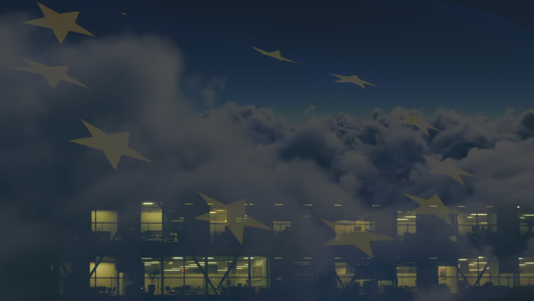 Animation depicts European Union flag projected over modern city at night with illuminated office buildings. Stars are visible in the atmospheric effects artfully merged with clouds. Perfect for illustrating concepts of international business operations, data exchange, and globalization. Can be used in presentations, articles about the European economy or digitally-focused storytelling centered on business networks.