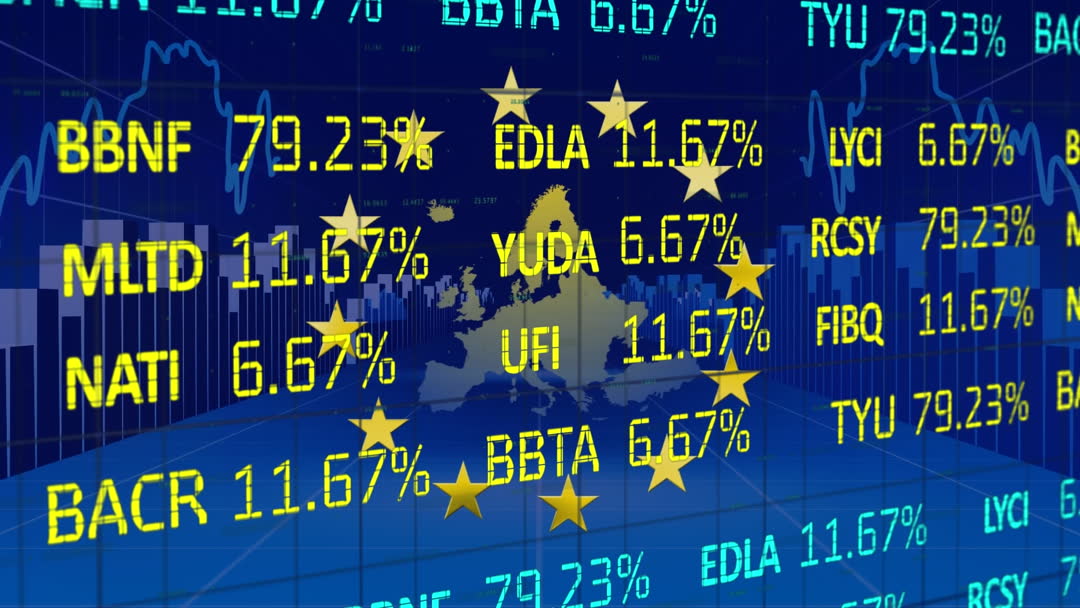 Animation depicting European Union flag overlaid with stock market data, illustrating Europe's financial markets. Useful for blogs, presentations, or educational content on European finance and economic performance.