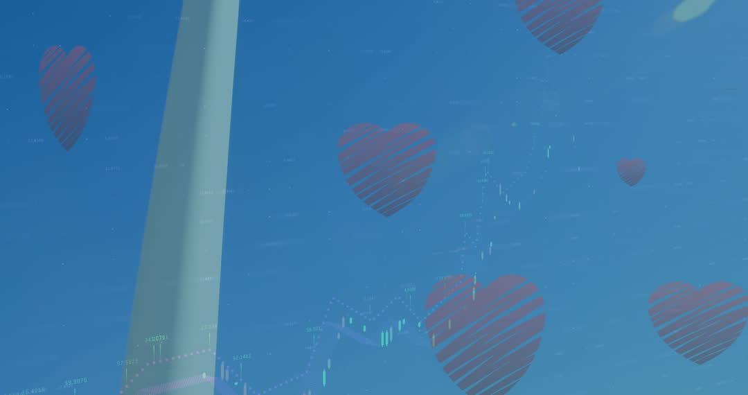 Animated depiction of European Union flag overlaid on a digital cityscape with technology elements. Features loves hearts and financial charts, symbolizing economic relationships and growth. Suitable for presentations about technology in Europe, stock markets, or urban development projects focused on digital transformation and trade alliances.