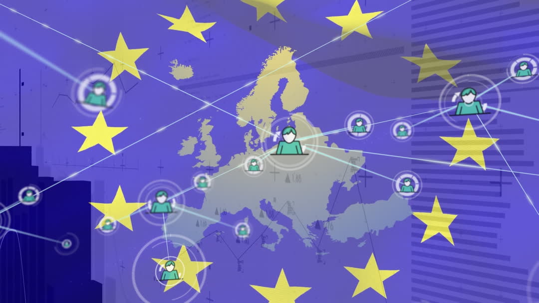 This visual represents a conceptual animation of networking and data processing, featuring the European Union flag, a map of Europe, and profile icons connected through digital lines. Perfect for illustrating topics related to EU's digital infrastructure, technology integration across countries, and global business networks. Useful in presentations, articles, and educational materials on technology, business connectivity, or EU subjects.