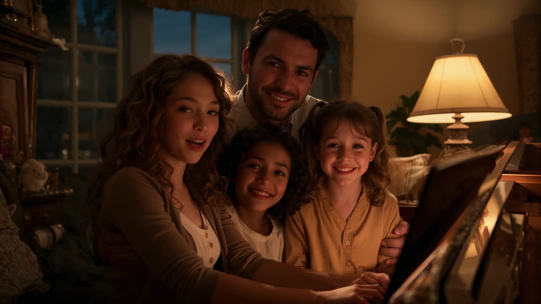 AI Generated Image. Clip showing family gathering around upright piano at dusk, playing together and smiling under warm lamp light. Scene highlighting parent and children bonding through music with intimate home interior and soft evening glow. Working well for lifestyle campaigns, music school promotions, family blog headers, parenting articles, holiday greeting videos, and streaming thumbnails. Emphasizing themes of togetherness, music education, evening routines, and cozy family moments. Suitable for use with subtitles, voiceover, or looped clip in digital ads, social media reels, online courses, and website hero sections. Color grading suggestions: warm tones, soft contrast, slight vignette to enhance intimate mood.