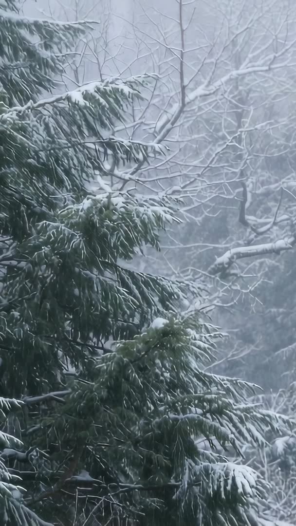 AI Generated Video. Vertical video showing evergreen branches gathering fresh snow while snowflakes drifting through misty woods. Tight vertical framing emphasizing needle texture and layered snow on branches. Muted green and cool blue palette creating tranquil winter mood. Suiting mobile-first projects such as Instagram Stories, TikTok, Reels, vertical ads, and app backgrounds. Serving seasonal campaigns, holiday greetings, travel promotions, nature or climate documentaries, meditation and relaxation videos, and weather segments. Looping friendly for ambient background or calming screens. Leaving clear space for overlay text or logo near foggy upper area for easy titling and branding.