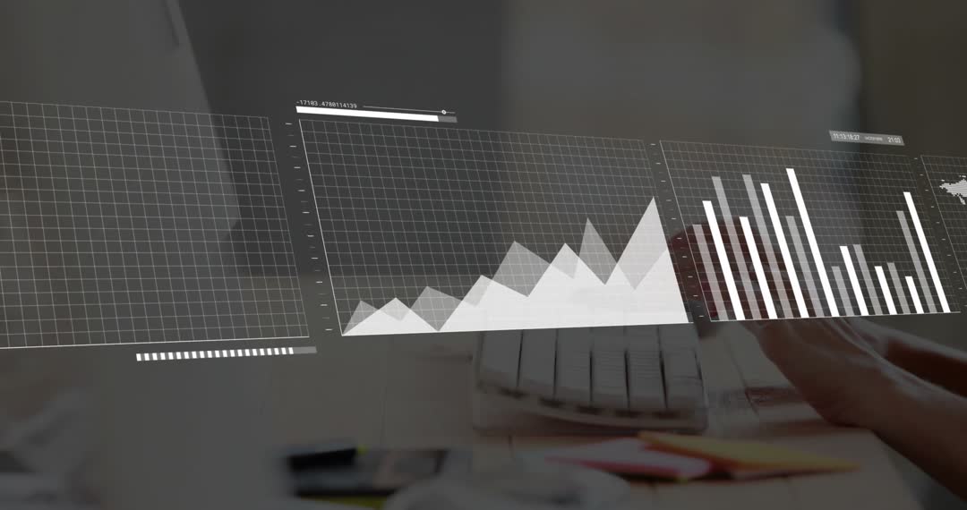 Hands type on keyboard as digital charts pulse and form on screen. Ideal for showcasing technology's role in business analytics and data visualization. Use in presentations, educational content on digital transformation, or applications in financial analytics.