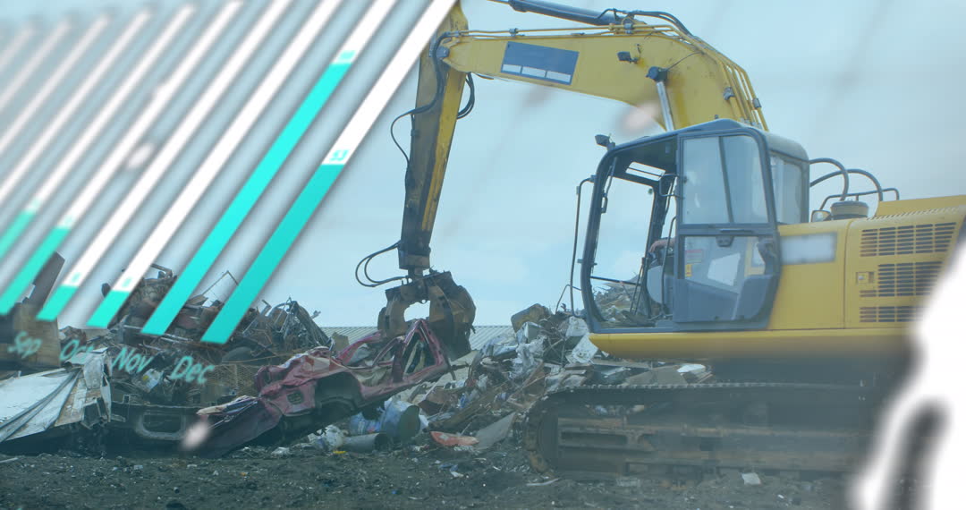 The scene shows a large excavator clearing scrap metal in a junkyard, overlaid with animated statistics and graphs representing data processing and technological insights. This juxtaposition highlights the intersection of heavy machinery and digital business applications. Ideal for illustrating concepts related to recycling processes, industrial operations, technology's role in sustainability, and data management in environmental industries.