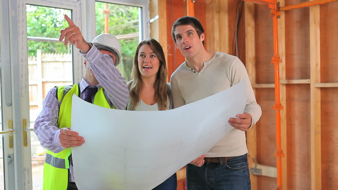 Couple looking at construction plans with a builder in a partially completed home. This video is fitting for real estate brochures, construction company promotions and DIY home renovation articles.