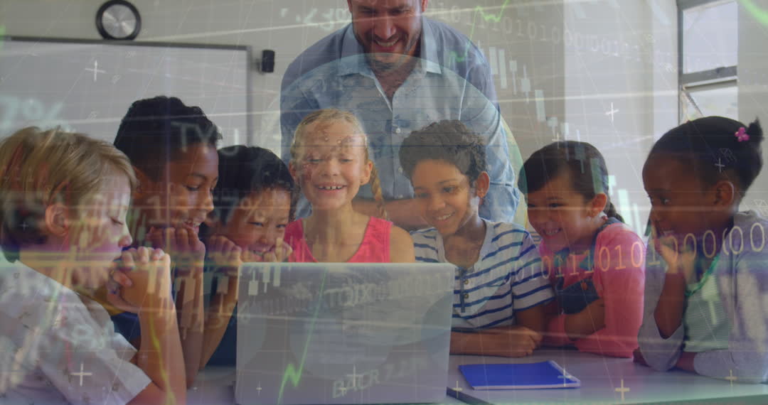 Multiracial group of students eagerly collaborating with a teacher while looking at a laptop, surrounded by visual elements representing coding, data grids, and maps. Perfect for illustrating concepts related to modern education, technology integration, teamwork in classrooms, and diversity in learning environments. Can be used in educational ads, technology blogs, or articles on digital learning in schools.