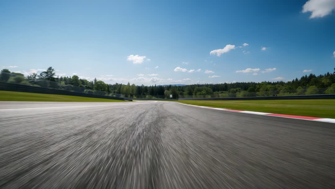 AI Generated Image. A ground-level view captures the excitement and speed of a high-octane racing circuit as the road curves to the right. Surrounded by lush greenery and expansive skies, this scene showcases dynamic motion and the thrill of racing. Ideal for sports enthusiasts, advertisements for automotive events, or dynamic travel campaigns.