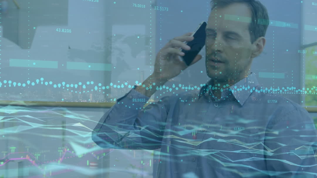 An executive conversing on a mobile phone, with transparent data visualizations overlaying foreground. This illustrates themes of global connectivity and modern business solutions. Useful for business promotions, financial services marketing, technology advertisements, and corporate presentations.