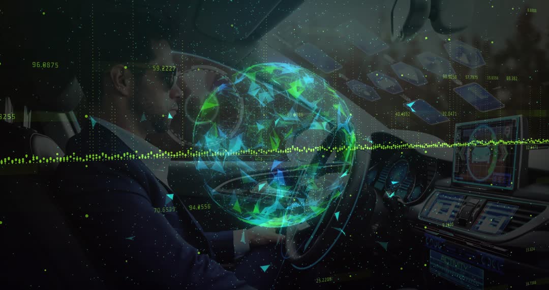 - Executive Driving Futuristic Car with Holographic Globe HUD and Live Data Waveform Display