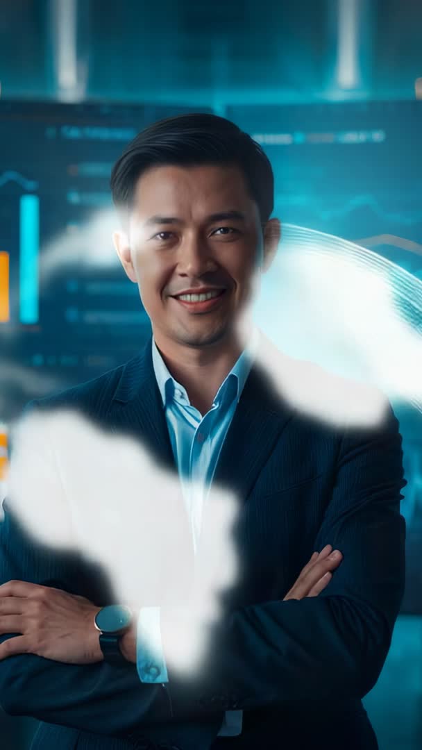 AI Generated Video. Vertical video featuring businessman in suit with arms crossed, smiling while digital globe overlay morphing and animated charts looping in background. Composition blending on-screen talent with high-tech HUD elements, blue-toned color palette, and cinematic lighting for polished corporate look. Suitable for corporate presentations, technology demos, fintech promos, investor pitches, leadership profiles, social media vertical ads, website hero sections, training modules, and conference openers. Use as opener for pitch decks, background for on-screen talent, thumbnail for webinar, promotional clip for software launch, or visual asset for data-driven storytelling and brand innovation messaging.