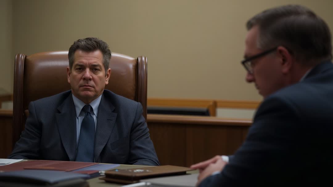 AI Generated Image. Video showing middle-aged executive sitting in leather chair at hearing table while colleague is consulting papers. Scene conveying formal corporate meeting or legal hearing with tense, focused mood. Composition highlighting executive facial expression, business suit and tie, binder and briefcase on table, wood-paneled interior and subdued lighting drawing attention to principal subject. Useful for corporate training footage, legal practice presentations, newsroom or documentary segments, business website banners, and articles about leadership, governance, negotiation, ethics and compliance. Suitable for background footage in corporate videos, courtroom reenactments, investor relations content, or advertising campaigns focusing on authority and professionalism. Options for editors: crop or trim for close-up on facial expression, widen for interaction between subjects, add lower-third title or overlay text for branding.