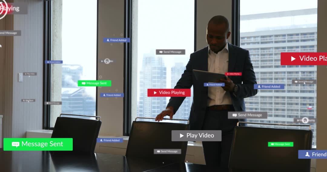 Depicting executive tapping tablet while digital UI overlays and notification badges float across boardroom windows and tablet display. City skyline visible through floor-to-ceiling windows providing corporate urban backdrop. Visual emphasizing interaction design, real-time messaging, video playback controls, and augmented reality concepts. Suitable for corporate technology presentations, enterprise software demos, UX case studies, marketing for collaboration tools, and training videos. Use as video clip for website hero banners, investor pitch decks, social media ads, or background for tech articles and product launch materials. Ideal for illustrating remote collaboration, digital transformation, mobile workflow, and modern office productivity.