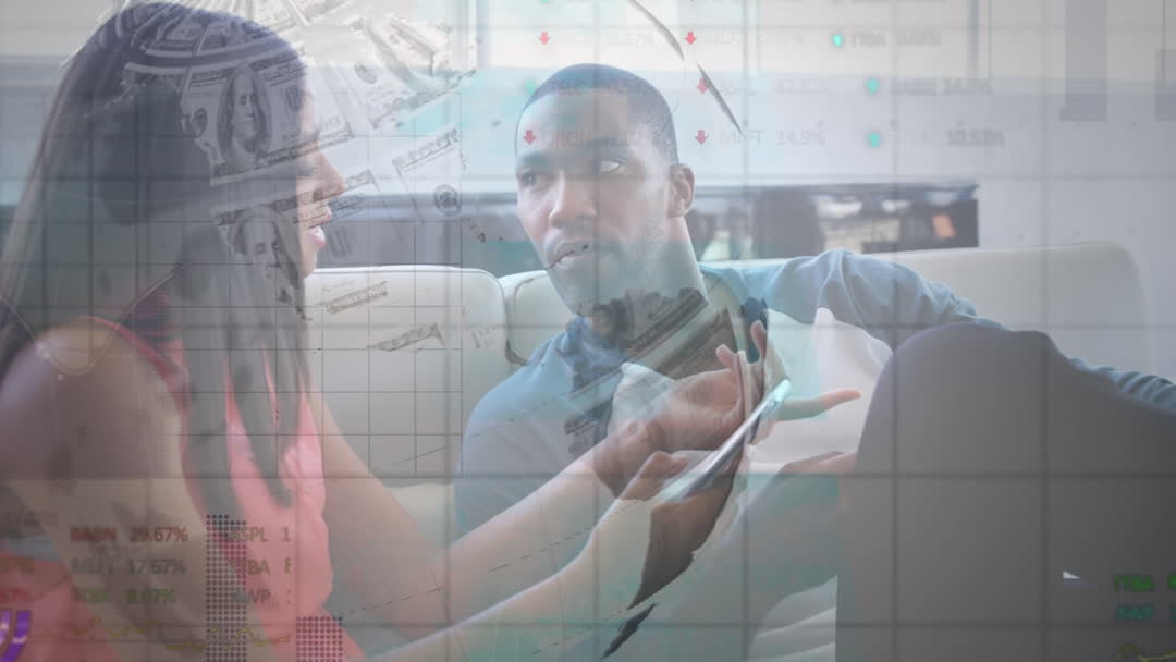 Group of executives discussing financial strategies with a digital tablet. Overlaid financial and global elements create a sense of worldwide connectivity. Useful for illustrating concepts of business analytics, international markets, economic growth, and teamwork.