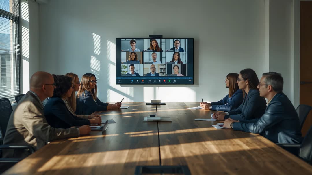 AI Generated Video. Video showing executive team holding hybrid meeting in boardroom, watching remote participants on large wall-mounted screen. Sunlight streaming through blinds, creating long shadows across wooden conference table. Participants using tablets and notebooks, taking notes, discussing strategy, reviewing presentation slides. Wide-angle composition capturing both in-room team and grid of remote attendees, emphasizing hybrid collaboration and modern workplace communication. Visual mood featuring natural daylight, warm wood tones, clean corporate styling and focused body language. Usage suggestions: - Use for corporate website hero, online training modules, blog posts about hybrid work and remote collaboration. - Use for marketing campaigns promoting video conferencing systems, unified communications platforms, or office technology. - Use for annual reports, investor presentations, internal communications, HR recruitment materials, leadership and teamwork articles. - Use for background footage in news segments or business documentaries covering workplace trends. - Use for social media ads and landing pages highlighting productivity tools or hybrid office solutions. Technical notes: - Horizontal widescreen composition suitable for full-screen playback and presentation backgrounds. - High contrast between light and shadow offering dramatic cinematic look.