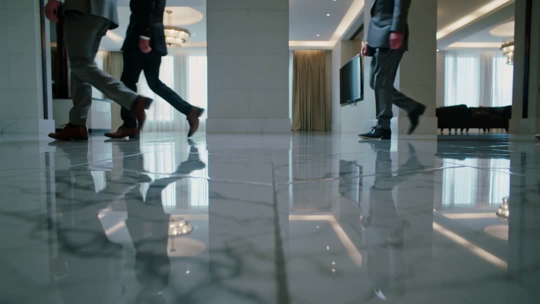 AI Generated Image. Showing executive team walking across polished marble lobby floor, creating strong visual of movement and professionalism. Low-angle framing capturing reflections of legs and chandelier, adding cinematic depth and symmetry. Ideal for corporate videos, website hero banners, investor presentations, executive profiles, and hospitality marketing. Pairing with title cards or logo reveals, using slow-motion or subtle speed ramp for dramatic emphasis. Color palette featuring cool neutrals and soft daylight, complementing corporate branding and on-screen graphics. Clip supporting themes of leadership, teamwork, arrival, business travel, and high-end workspace. Delivering versatile footage for commercial, editorial, and training use, and fitting seamlessly into conference openers, recruitment campaigns, and company overview reels.