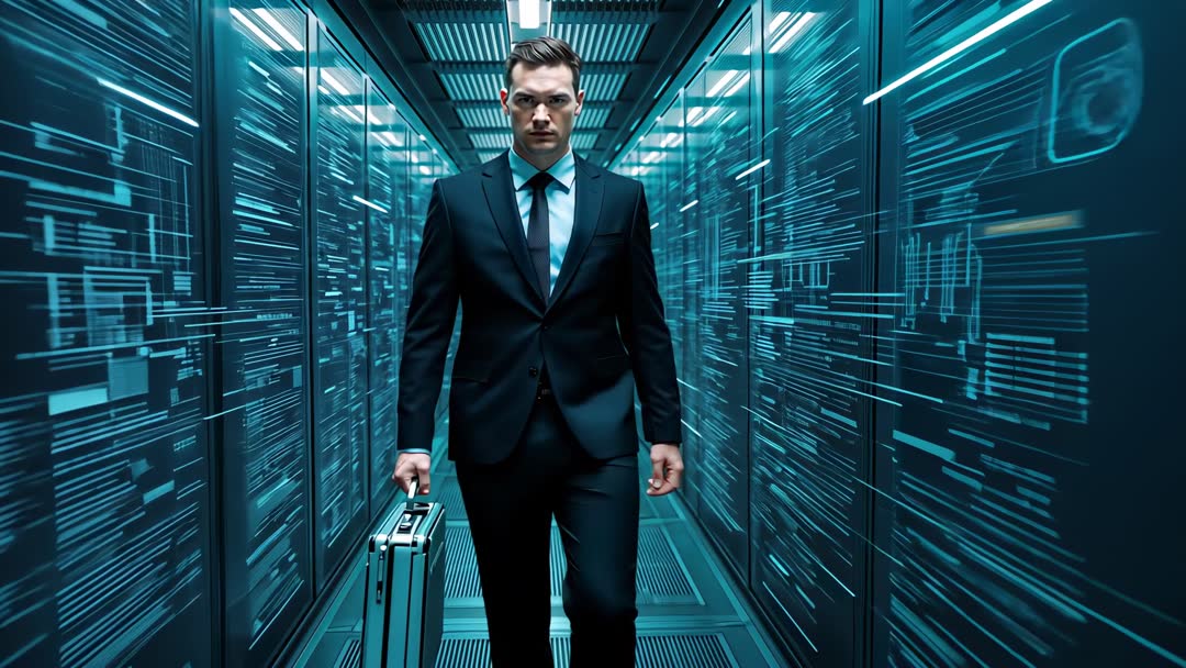 AI Generated Image. Video showing corporate executive walking down futuristic corridor lined with glowing data streams and server racks, carrying metal briefcase. Suiting corporate security presentations, cybersecurity awareness campaigns, technology websites, leadership reels, executive recruitment videos, keynote visuals, investor pitch decks and training modules about data protection. Conveying confidence, urgency and high-tech professionalism with teal color grading and dynamic motion blur emphasizing speed and information flow. Allowing space for lower third titles and logo overlays, enabling simple text animations on left or right side and smooth looping for background playback. Ideal for tech startups, cybersecurity vendors, IT consultancies and financial firms presenting secure data management or executive leadership messaging.