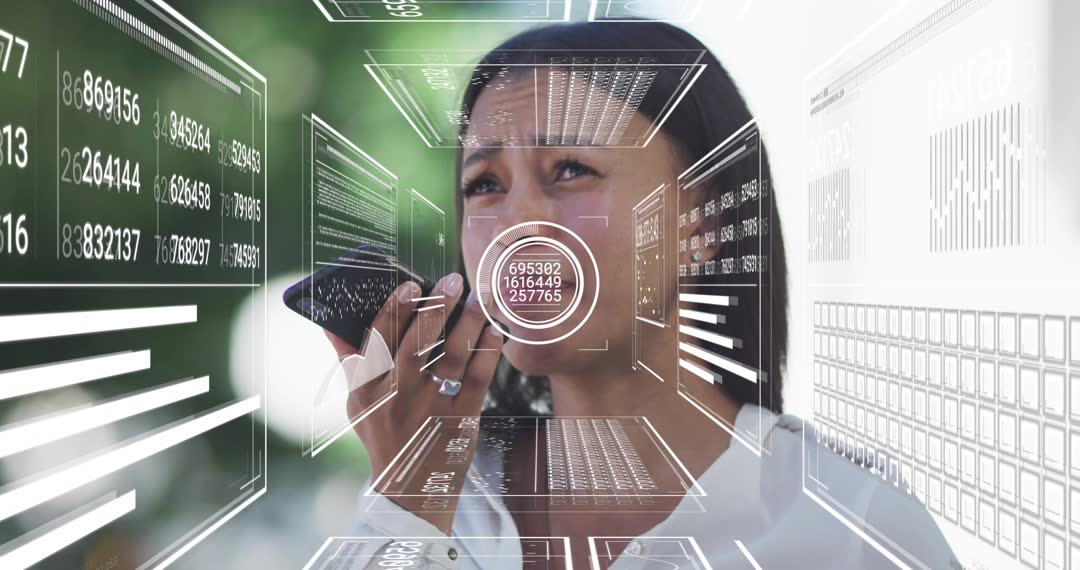 - Executive woman speaking into smartphone while interacting with futuristic HUD interface
