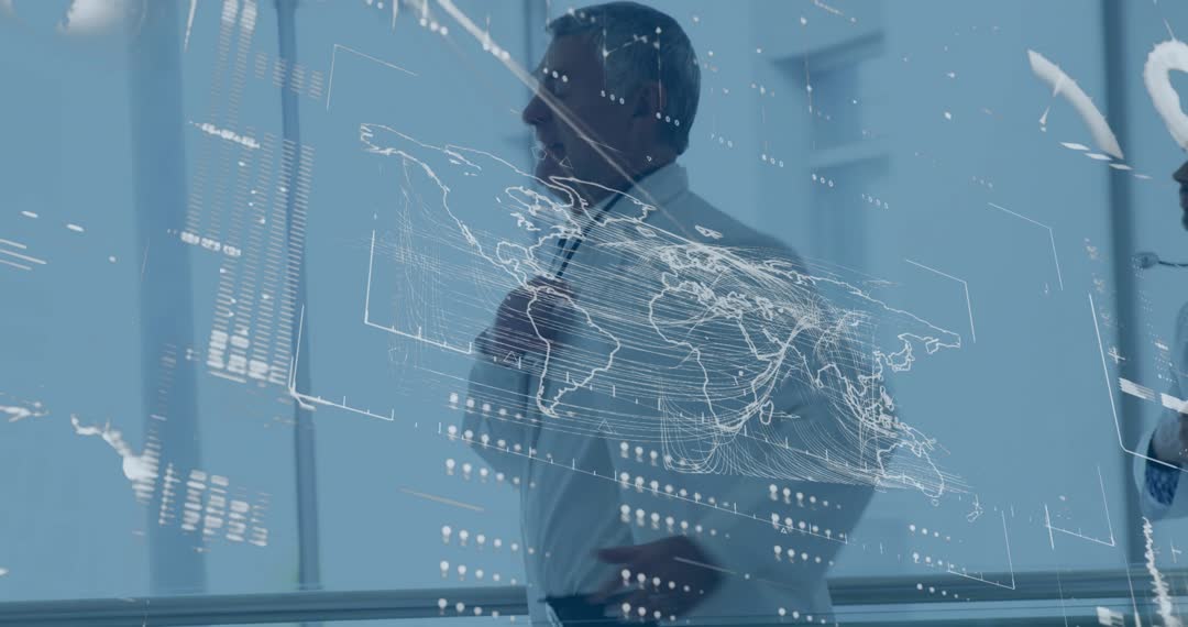 Executives in modern office reviewing digital map overlay showing global data, symbolizing technological advancement and innovation. Scene suggests themes of global connectivity and strategic planning. Suitable for portraying corporate innovation, business strategy, teamwork, and leadership in digital contexts.