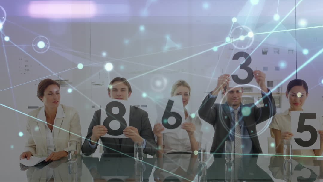 Business professionals are holding scorecards with numbers in a modern office setting, overlaid with animated data connections. This portrays integration of traditional evaluation methods and digital technology influence. Ideal for illustrating themes of modern business, technology in evaluation, corporate decision-making processes, and data-driven environments.
