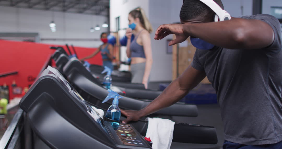 Group of diverse individuals in gym, running on treadmills while wearing masks. This captures a pandemic workout scenario emphasizing safety and fitness. Useful for illustrating topics on maintaining health routines during COVID-19, gym precautions, or personal fitness efforts during lockdown.