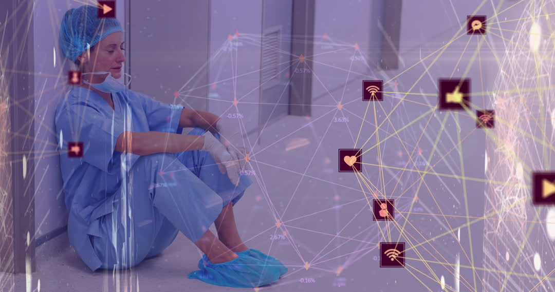 A fatigued female healthcare professional sits on the floor, dressed in scrubs with a digital network overlay. This illustrates the pressures faced by medical workers and the increasing role of technology in healthcare. Useful for topics on healthcare challenges, medical advancements, or technology in medicine.