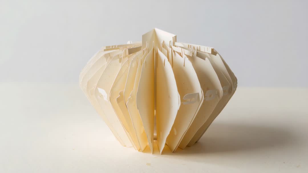 - Expanding cream paper sculpture unfolding into geometric fan with adhesive tabs