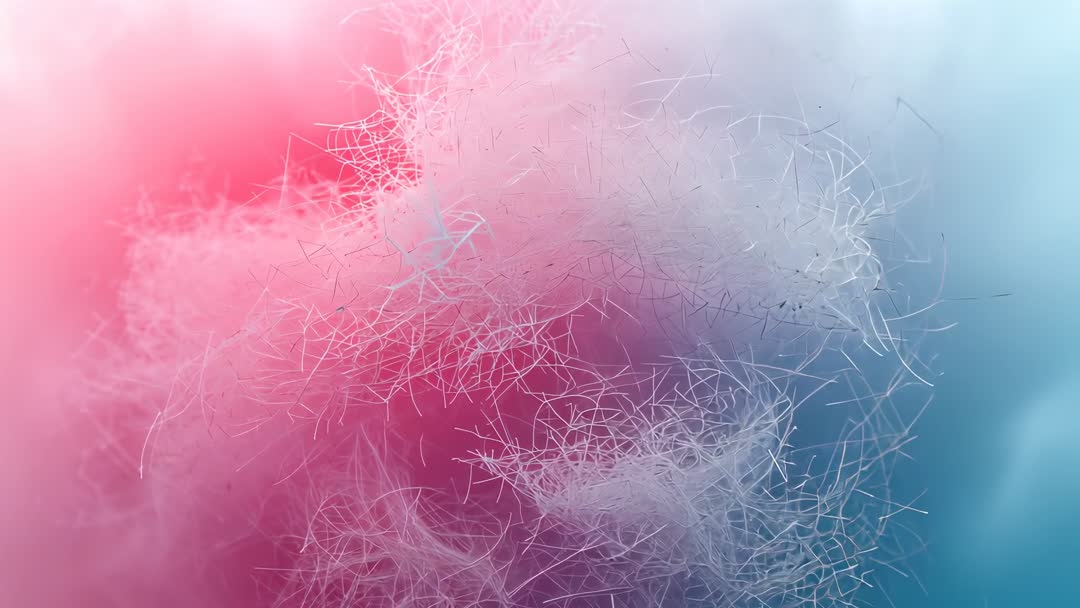AI Generated Image. Featuring slow-expanding fibrous cloud releasing thin white filaments across soft pink to blue duotone gradient. Fine threadlike structures drifting and overlapping, producing airy tactile texture and cinematic depth. Lighting shifting between warm pink and cool cyan, enhancing pastel contrast and immersive mood. Working well for background loops, title reveals, brand intros, music visuals, wellness and beauty promotions, social media reels, product hero sequences. Serving abstract science and biotech themes, fiber optics and textile design presentations, and motion graphic overlays. Complementing digital campaigns, website headers, broadcast spots, and presentation openers. Offering smooth loop potential, color grading flexibility, and compatibility with slow zoom or parallax animation.