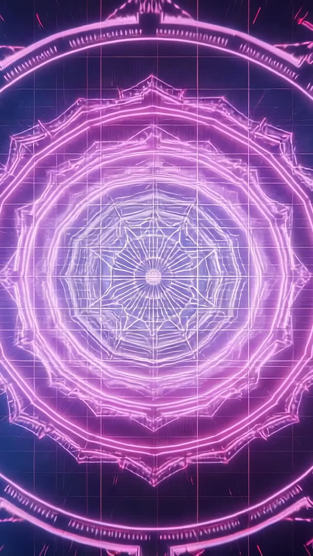 AI Generated Image. Expanding neon fractal mandala over grid with rain effect, creating hypnotic cyber atmosphere. Glowing pink and purple hues blending into vibrant synthwave palette. Looping vertical format optimized for TikTok, Instagram Reels, YouTube Shorts, mobile ads. Serving as background for EDM performances, VJ sets, meditation apps, digital art installations. Pairing with electronic music, ambient soundscapes, narrated mindfulness tracks. Using high contrast neon outlines and grid to emphasize motion and depth. Providing 4K resolution and seamless loop for projection and social platforms. Offering customization options such as color grading, speed control, overlay text for titles or branding.