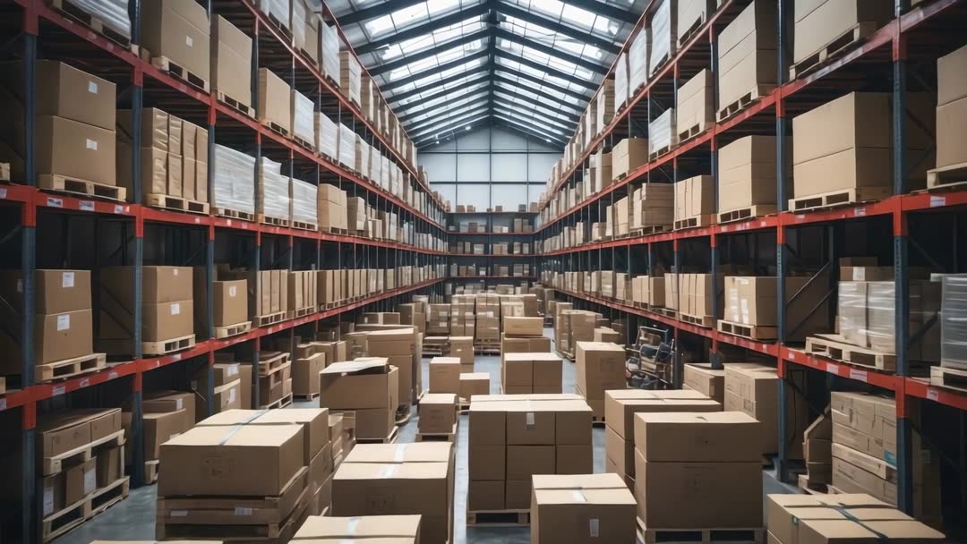 - Expansive Warehouse Aisle with Shelving and Boxed Inventory