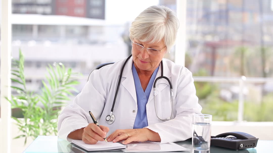 Senior female doctor present in bright office writing patient notes while having phone discussion. Ideal for medical, healthcare advertisements communicating professionalism and client services.