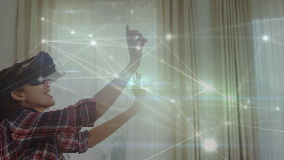 A woman wearing a VR headset reaches out to interact with a network of digital connections, hinting at an immersive technology experience. Useful for illustrating innovative technological advancements, digital interactivity, or future-driven environments where connectivity plays a central role.