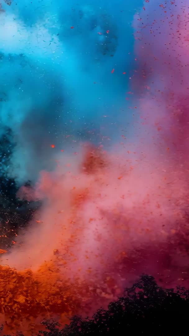- Exploding orange plume merging with cyan and magenta clouds in vertical colorburst video