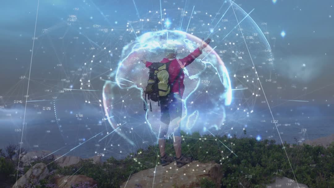 This scene depicts a hiker celebrating atop a summit, blendd with a digital globe, symbolizing technology and global connectivity. Ideal for concepts involving tech innovation, exploration, digital world initiatives, adventure and new achievements ties in with futuristic forecasting presentations or creative promotional materials centered around the power of technology and connectivity across the world.