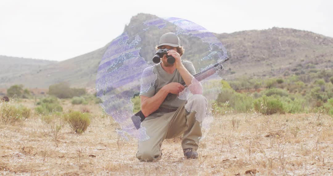 A man with binoculars and rifle crouching in expansive wilderness. Transparent digital globe symbolizes technological mapping and global exploration. Useful for themes on adventure, scouting methodology, technology in nature, and contemporary hunting practices.