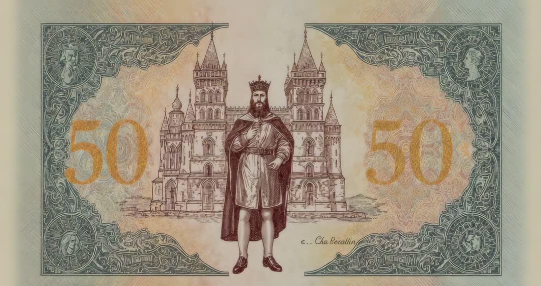 AI Generated Image. This video frame captures the essence of a royally designed banknote featuring an extraordinary illustration of a crowning monarch and a fantasy castle. The design, reminiscent of historical currency, focuses on intricate and ornate patterns. Zooming into the center reveals exquisite details emphasizing regality and classicism. This artwork can be utilized in discussions or projects revolving around historical currency design, fantasy graphic design concepts, or even in storytelling for creative historical documentaries.