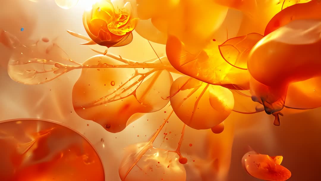 AI Generated Image. This digital backdrop showcases vibrant amber-orange spheres dynamically merging within a fluid-like digital environment, enhanced by organic filaments extending across the scene. Ideal for use in artistic showcases, design inspiration for futuristic and abstract analytics, or as a visually striking element in digital presentations focused on AI-generated art and dynamic movements.