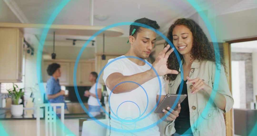 Scene depicts couple using advanced technology in smart home environment with digital interface overlay. Ideal for visuals related to futuristic technology, smart home features, and innovation. Perfect for advertising technology-driven products or services and demonstrating ease of integration of digital technology in everyday life.