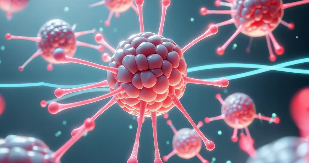 AI Generated Image. Video showcases spherical structures with spikes immersing and rotating in a fluid environment, accompanied by an undulating helical strand. This visualization captures the essence of molecular and scientific exploration, creating a futuristic and abstract composition. Ideal for use in scientific research presentations, visualizations of molecular structures, and educational content focusing on molecular biology and advanced scientific studies.